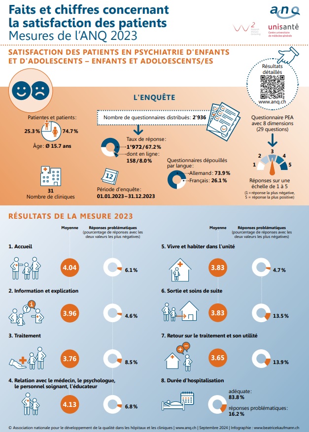 Au total, 1’972 enfants et adolescent∙e∙s ainsi que 1’279 parents ont participé à l’enquête de satisfaction nationale menée tout au long de l’année. Pour la première fois, le questionnaire s’adressait également aux parents d’enfants de moins de 11 ans. Ces derniers ne représentaient toutefois qu’une faible proportion d’à peine 4 % des participant∙e∙s à l’enquête adultes. Pour les enfants et les adolescent∙e∙s, le taux de retours a été de très bon, atteignant 67,2 % (contre 53,9 % en 2021). Pour les parents, le taux de retours est passé à 45,0 % (contre 40,1 % en 2021). En psychiatrie d’enfants et d’adolescent∙e∙s, l’enquête de satisfaction de l’ANQ a lieu tous les deux ans, la prochaine édition sera en 2025.