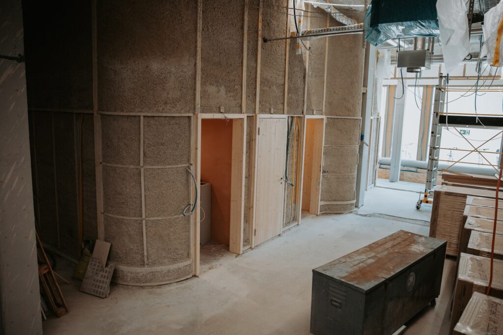 Ce qui distingue ce projet d’autres rénovations hospitalières, c’est la place donnée aux matériaux naturels et au réemploi. Bois, liège, chanvre, terre crue, enduits à la chaux … autant d’éléments choisis pour leurs propriétés écologiques, mais aussi pour leur potentiel esthétique et sensoriel. Le béton de chanvre, par exemple, issu de plantes locales qui absorbent du CO₂ durant leur croissance, a été utilisé pour ses qualités thermiques et environnementales.