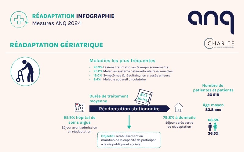 L’ANQ a publié les résultats des mesures nationales de la qualité 2024 dans le domaine de la réadaptation stationnaire. Ceux-ci montrent qu‘en moyenne, les patient∙e∙s ont réalisé des progrès comparables à ceux de l’année 2023 au cours de leur séjour en clinique. Ces succès thérapeutiques sont d’autant plus remarquables que la durée des séjours a diminué dans plusieurs domaines de réadaptation et que les valeurs mesurées indiquent qu‘à leur admission, les patient∙e∙s présentaient un état de santé similaire, voire plus sévère qu’en 2023.