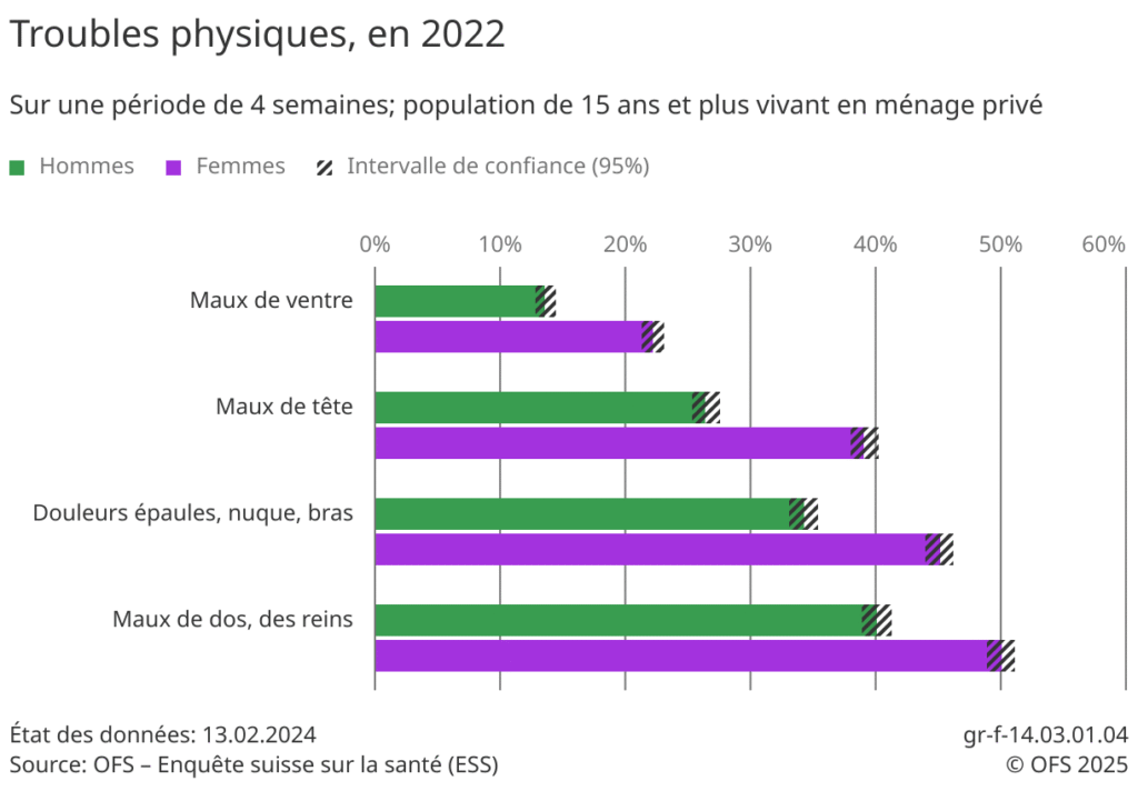 L’ESS 2022 montre que les femmes sont plus nombreuses (12%) que les hommes (8%) à révéler des symptômes de dépression modérés à sévères, la différence atteignant le double chez les jeunes de 15 à 24 ans (26% pour les femmes contre 13% pour les hommes). Les jeunes femmes de 15 à 24 ans sont également nettement plus nombreuses que les hommes du même âge à affirmer avoir été en traitement pour des problèmes psychiques au cours des douze derniers mois (14% contre 4% pour les hommes).